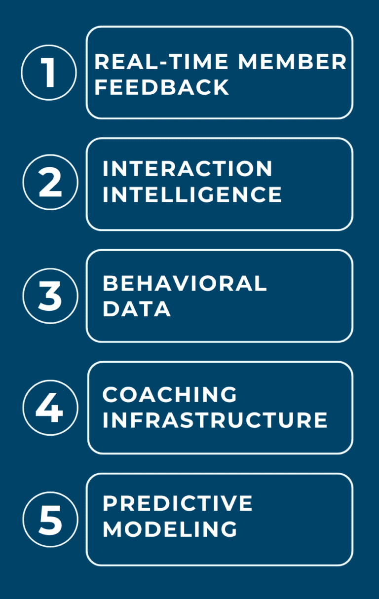 This creates predictive models identifying members at risk of attrition before they leave.
